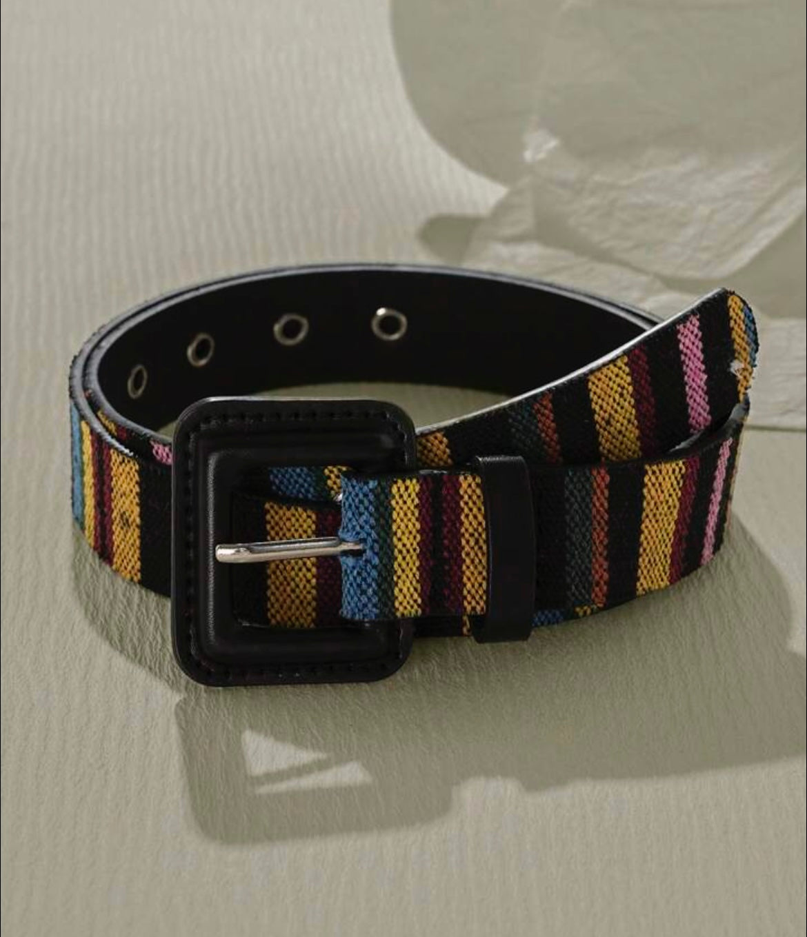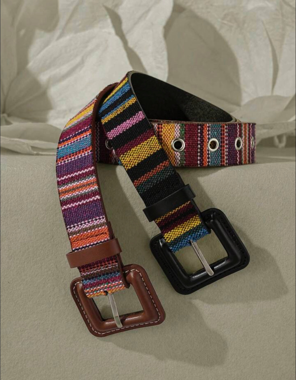 Cinturón con base de cuero sobre el que se tejen hilos de algodón. El acabado lateral es un cordón trenzado de piel natural. El largo del cinturón es de 80 cm aprox.