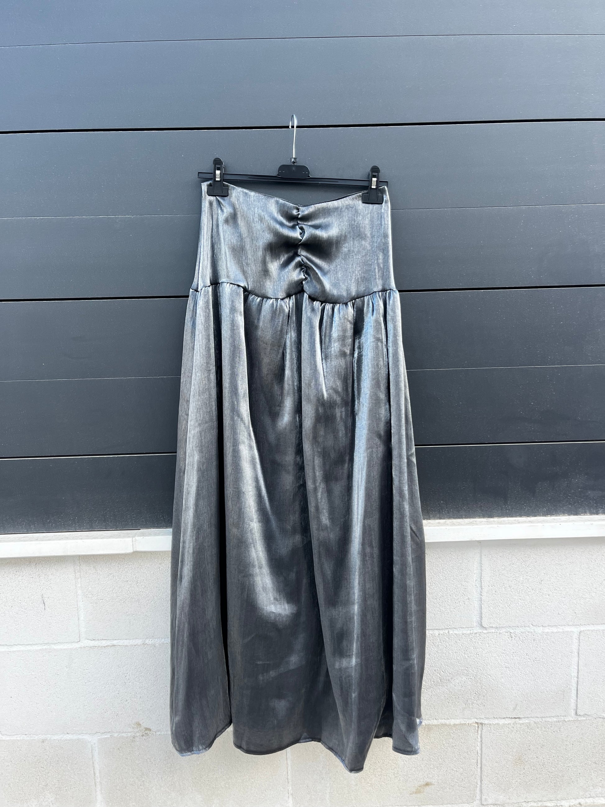 Falda satinada en color plata, talla única (aproximadamente desde una S hasta una L).